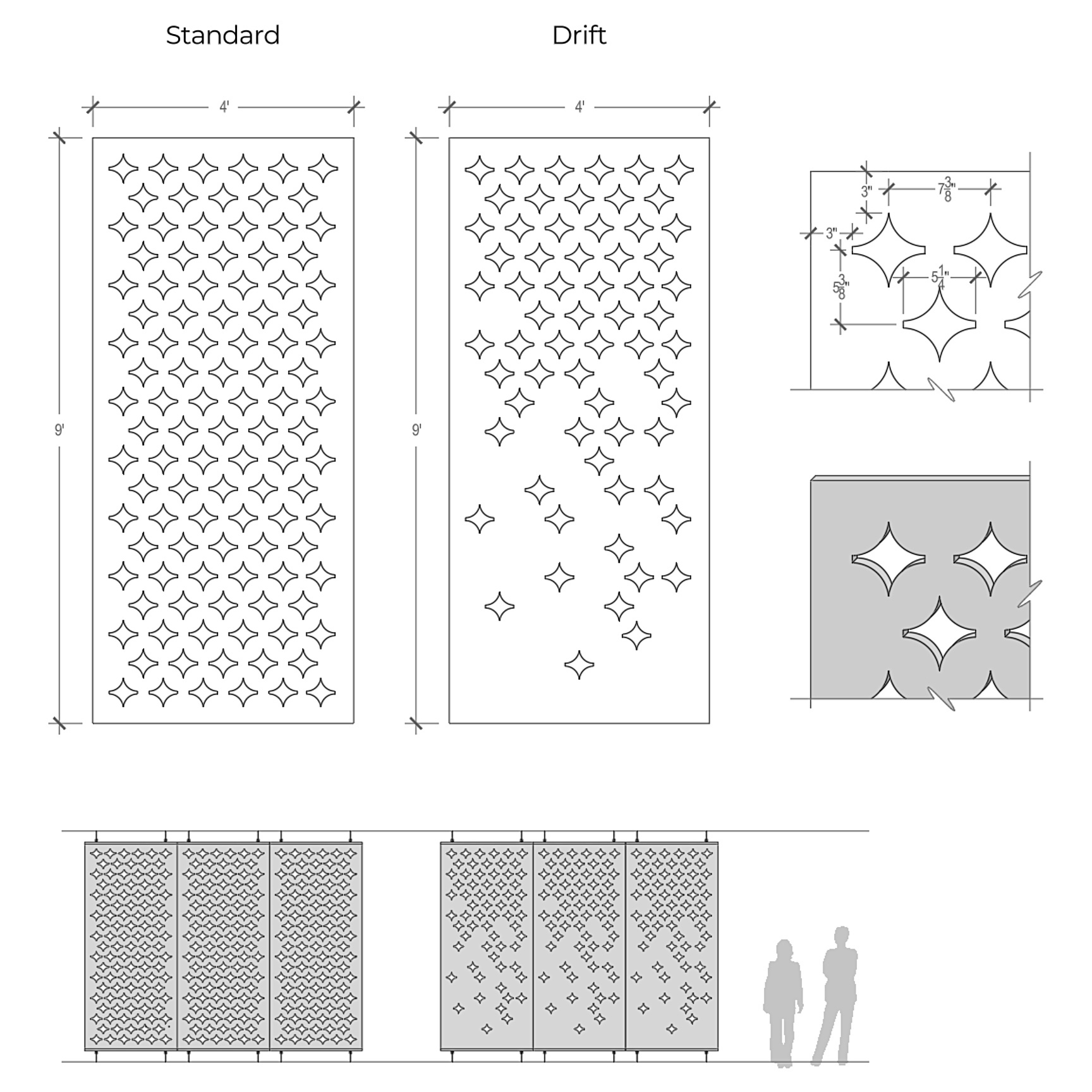 Available in two versions, Glint and Glint Drift, the Drift option opens up as the diamond count gradually reduces toward the bottom of the panel. Referencing both natural phenomena and mid-century perforated screen systems, it provides spatial division while maintaining openness.